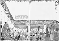 Hittorf's beautiful façade was initially preserved, as was the stage, albeit modernised, but the auditorium changed completely. The armchairs were replaced by a dance floor around which tables and chairs were set up that could seat 1,000 patrons; behind the boxes, a gallery; on the first floor, a balcony; the whole profusely flowered by heavy beds of roses, wisteria, stylised plants and intoxicatingly fragrant flowers, stretching up to the roof, giving the place the allure of a garden from Arabian Nights, sparkling with luminous fountains. It was inaugurated in May 1926 as the Restaurant-Théâtre des Ambassadeurs.[9][12][13]