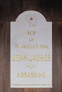 The assassination is still remembered in the café: in 1923, a commemorative plaque was added to the façade by the Human Rights League;[4] a red and golden floor mosaic shows the date of Jaurès's death and the exact place where he fell.[5] Additionally, a window shelters a part of Jaurès's chair, his hat with a bullet inside,[6] and the two front pages of the newspaper L'Humanité of 31 July and 1 August 1914.[7]
