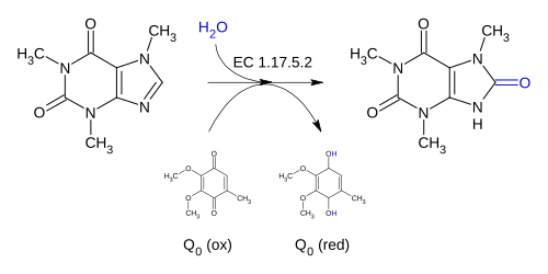 Caffeine dehydrogenase is responsible for catalyzing the oxidation of caffeine directly into trimethyluric acid, and the enzyme uses coenzyme Q0, also known as ubiquinone, as an electron acceptor. This is done by incorporating an oxygen atom from a water molecule into the C-8 position, and the overall reaction can be seen in the following chemical reaction: