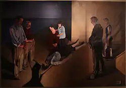 One of his best-known paintings, After the Orgy (1928), shows three nude women (apparently the same model in three different poses) asleep on a floor littered with wine bottles, playing cards and cigarettes, with an effect "more depressing than titillating".[2] The clinical realism of this work is also seen in his still lifes, which often represent crabs, lobsters, or glass objects that he painted with chilly precision. His health disintegrated in the 1940s, and he spent the war years hospitalized in Venice, where he died on May 29, 1946.[2]