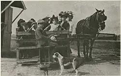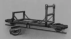 The hand-operated lorries had 250 mm (10 inch) diameter wheels, but the larger vehicles driven by mules or horses had 500 mm (20 inch) diameter wheels. The traction of the carriages was applied from the side by means of one or two levers, and kept in balance by the operator or the draft animal. The freight wagons had two angled levers connected by moving shafts in which the horses were clamped. The distance between the floor of the vehicles and the rail never exceeded a few centimeters to keep the center of gravity as low as possible, thereby minimizing the effort required to maintain balance. When the lorry was not used it lay on one side. Some of the lorries had movable tail lifts to facilitate loading and unloading.[3]