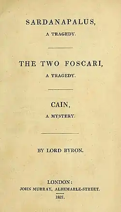 Cain is a dramatic work by Lord Byron published in 1821. In Cain, Byron dramatizes the story of Cain and Abel from Cain's point of view. Cain is an example of the literary genre known as closet drama. The play was dedicated to Sir Walter Scott.[1]