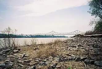 The bridge originated as a toll bridge in 1929, constructed by the American Bridge Company and the Missouri Valley Bridge & Iron Co.[7][2] Traveling downstream, the Cairo Mississippi River Bridge is the southernmost crossing of the Mississippi River prior to its confluence with the Ohio River and lies just 2000 feet west of the mouth of the Ohio.[8]