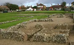 In the 1950s, a building near the south gate at Caister was excavated in advance of a housing development. These buildings do not appear to be military as they include a hypocaust and painted wall plaster as well as female jewellery, and it has been suggested that this building may have been an officer's house, or possibly a ‘seamen's hostel’ which may be a polite name for a brothel. The site appears to have been abandoned in the 5th century, but 150 Saxon burials have been found to the south of the enclosure.[1] The remains excavated in the 1950s are now managed by English Heritage and are open free of charge to the public as Caister Roman Site.