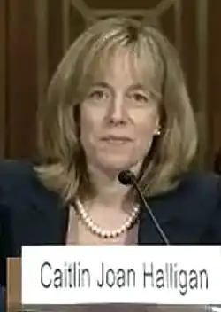 Caitlin Joan Halligan (born December 14, 1966) is an American lawyer who has served as an associate judge of the New York Court of Appeals since April 2023. She served as Solicitor General of New York from 2001 until 2007. President Barack Obama nominated her several times to fill a vacancy on the United States Court of Appeals for the District of Columbia Circuit, but the U.S. Senate did not vote directly on the nomination, and in March 2013, Obama withdrew the nomination at her request.