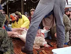 The traditional Cajun outdoor food event is hosted by a farmer in the rural areas of Acadiana. Family and friends of the farmer gather to socialize, play games, dance, drink, and have a copious meal consisting of hog and other dishes.[3]: 111 Men have the task of slaughtering a hog, cutting it into usable parts, and cooking the main pork dishes while women have the task of making boudin.[3]: 110