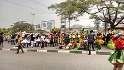 Calabar Carnival is an annual carnival held in Cross River State, Nigeria.[1] Also known as Africa's Biggest Street Party,[2] the carnival holds every December and was declared by the then governor of Cross River State, Mr. Donald Duke as an activity to mark Christmas celebration yearly. He said his vision for creating the festival was to make Cross-River a home of tourism and hospitality in Nigeria and Africa. The quality of the festival has grown over the years making it Nigeria's biggest carnival and an internationally recognized festival. It used to be a month-long event that began on the 1st of December, until the former governor of the state, Benedict Ayade reduced it to two weeks after he was elected. During the 2017 carnival, Former governor Benedict Ayade said in his speech that the carnival is to showcase Africa as the richest continent and a blessed place where the young ones should be proud to belong. The carnival has always been entertaining and colourful as different competitions take place and huge cash prizes are won.[3][4] Calabar which is also known by the name Canaan City, is a city in south-eastern Nigeria. Calabar is actually the capital city of Cross River State. Calabar sits adjacent to the Calabar and Great Kwa Rivers and Falls as well as the creeks of the Cross River.