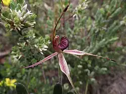 Caladenia ampla, commonly known as the dainty spider orchid,[2] is a plant in the orchid family Orchidaceae and is endemic to Victoria. It is a ground orchid with a single hairy leaf and a single flower which is sometimes yellowish-green flower with red stripes and sometimes entirely red.