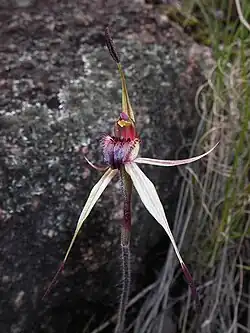 - ^ a b c Misiak, Weslawa; Bostock, Peter; Mayhew, Melissa. "Caladenia atroclavia". Department of Environment and Heritage Protection. Retrieved 2 October 2016.