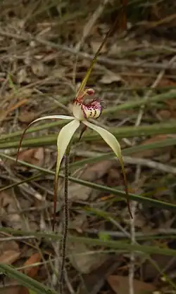 Caladenia brumalis, commonly known as winter spider orchid,[2] is a species of flowering plant in the orchid family Orchidaceae and is endemic to South Australia. It has an erect, hairy leaf and usually a single white to pinkish flower with darker markings. It is only found in a few places due to habitat loss and is considered to be vulnerable.