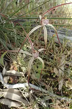 Caladenia erythronema, commonly known as the red thread spider orchid[2] and Nyabing spider orchid,[3] is a plant in the orchid family Orchidaceae and is endemic to the south-west of Western Australia. It has a single hairy leaf and up to three red, yellow or cream-coloured flowers with dangling, thread-like sepals and petals and a small labellum.