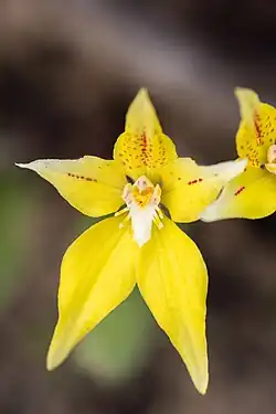 - Caladenia flava subsp. maculata Hopper & A.P.Br. [8] which has lemon-yellow flowers with brownish of red blotches and eight to sixteen teeth on the labellum, occurring mostly north of Geraldton and commonly known as the Kalbarri cowslip orchid;[2][3][4]