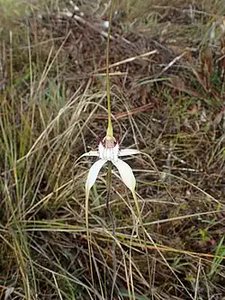 Caladenia splendens, commonly known as the splendid spider orchid,[2] or splendid white spider orchid[3] is a species of orchid endemic to the south-west of Western Australia. It has a single erect, hairy leaf and up to three mostly white flowers with a fringe of long teeth on the sides of the labellum. Along with the giant spider orchid, Caladenia excelsa it is the largest of the spider orchids.