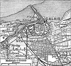 In many places, the enceinte was overlooked by suburban buildings built in the nineteenth century. Two of the southern bastions and the wall linking them had been demolished to make way for railway lines, leading to railway sidings and quays of the Gare Maritime in the harbour. About 0.99 miles (1.6 km) outside the enceinte to the west was Fort Nieulay. Two other forts to the south and east were derelict or had disappeared.[2][3] Outside the town, low ground to the east and south is cut by ditches, which limit the landward approach to roads raised above ground level. To the west and south-west, there is a ridge of higher ground between Calais and Boulogne, from which Calais is overlooked.[1]