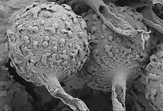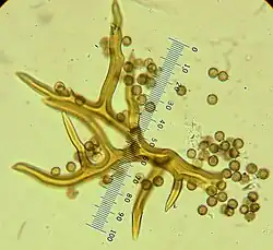 | Light micrograph of the characteristic antler-branched capillita | Electron micrograph of capillita and spores | The spores have a faintly warted surface and a pedicel. |