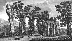 The route started near Corliano (Conserva di Corliano), where an inscription was found (CIL XI 1433) which reports the date of construction of the aqueduct as 92 AD by Lucius Venuleius Montanus Apronianus,[2] patron of the Pisan colony and consul of Attidium (Roman city near Fabriano). The underground pipeline, consisting of fistulae aquariae in glazed terracotta and supported by a masonry base, descended from the mountain as far as Caldaccoli, here the water was conveyed into a large basin and then channelled onto the arches.