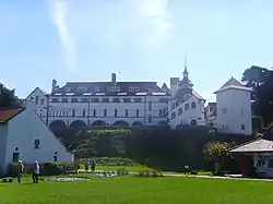 Caldey Island thrived as a centre of Cistercian activity in the Middle Ages.[3][4] The current abbey is modern; it was built in 1910 by Anglican Benedictine monks; they converted to Catholicism and became members of the Trappist Order in 1929.[5] As of 2018, there are about 10 members.[6]