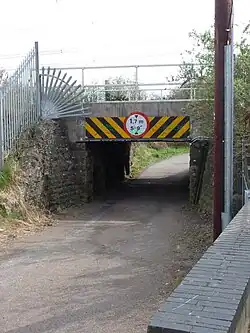Caldicot station opened as a passenger halt on 12 September 1932.[6] The road serving the station had been here for many years beforehand, since the building of the tunnel. It crosses the low tunnel line by an overbridge, then passes under the Gloucester line by an unusually low underpass.[7] This underpass was originally provided to give farm access to the land of the Caldicot Levels south of the railway and it is a mark of the passenger station's minor importance that such a restricted access continues to this day.