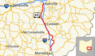 State Route 821 (SR 821) is a north–south state highway in the southeastern portion of the U.S. state of Ohio. A state-maintained section of the old US 21, its southern terminus is at SR 60 approximately 2 miles (3.2 km) north of Marietta, and its northern terminus is at I-77 in Byesville, along with the eastern terminus of SR 209. The route is entirely undivided surface road, and is much less direct than the newer I-77 which supplanted it as a through route. As the interstate was being built, the designation of US 21 was moved to the freeway before Ohio wholly decommissioned the now-superfluous U.S. route. SR 821 was designated about two years after US 21 was moved onto I-77 in southeastern Ohio.
