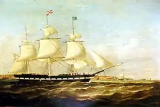 The Caleb Grimshaw was built in early 1848 for Liverpool-based Caleb Grimshaw and Co. at William H. Webb's New York City shipyard as a full-rigged sailing ship.[1][2][3] She was 166 feet (51 m) by 36 feet 8 inches (11.18 m) by 21 feet 8 inches (6.60 m) with a tonnage of 988.[4] Caleb Grimshaw and Co. specialized in the packet trade, coordinating the transportation of cargo and emigration traffic across the Atlantic.[5][1] The ship was presumed to be named after Caleb Grimshaw posthumously as he had died unexpectedly in early 1847.[1][3] Under Captain William Hoxie, she sailed from Liverpool to New York City with a maximum of 427 passengers, mostly emigrants from England and Ireland.[3] The Caleb Grimshaw made five successful crossings of the Atlantic between May 1848 and August 1849.[6]