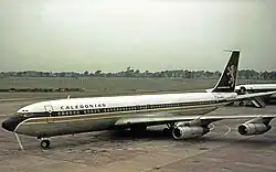 Caledonian planned to place an order directly with Boeing for two convertible 707-320Cs that could either be operated in an all-passenger or all-cargo configuration and featured a large freight door on the left-hand side of the forward fuselage to enable carriage of main deck cargo when configured as a freighter. The initial order needed to be placed before the end of 1965 to secure the first aircraft's delivery in May 1967, just in time for that year's summer season.[55][87][88][89] To avoid paying the 14% tax the UK Government had imposed on imported, new foreign aircraft to protect competing British models,[90][91] Caledonian needed to persuade the BOT that there was no equivalent home-grown alternative. It also cited the BOT's earlier decision to approve BOAC's application for an import duty waiver on two new Boeing 707-336Cs as a precedent.[90] However, the BOT was unwilling to grant Caledonian the requested tax exemption[89][92] and was instead assisting Vickers in selling it the Super VC10, the stretched version of the original "standard" VC10 and Britain's answer to the all-American 707 and DC-8. Despite the BOT's and Vickers's best efforts, Caledonian's senior management remained unconvinced that the Super VC10 was a worthy competitor of the 707. The results of its evaluation had shown that the Super VC10 was not competitive with the 707, in terms of amortisation, resale value and availability of finance due to its small production run. Apart from its insufficient range to fly non-stop from the UK to the US West Coast with a viable payload, significantly smaller cargo capacity and lack of passenger/freighter convertibility, the Super VC10 was also heavier than the 707. This increased fuel consumption.[89][93][94] In its ongoing negotiations with the BOT, Caledonian cited these findings as evidence that there was no suitable British alternative to the 707 for the envisaged role. The BOT however continued to insist that irrespective of Caledonian's specific requirements, the 707 and Super VC10 were equivalent and, based on this assessment, refused the airline's application for an import duty waiver.[92] Meanwhile, the civil engine production hold-up caused by the Vietnam War resulted in the first aircraft arriving in July rather than May 1967. This did not allow its utilisation for that year's full summer charter season precluding a profitable operation. These circumstances compelled Caledonian to lease out its first 707 to the Flying Tiger Line until May 1968. To facilitate the 707's smooth introduction into service the following summer, Caledonian required access at its Gatwick base to its second aircraft (ordered in 1966) for as much as winter 1967–68 as possible to complete aircrew and ground support training in time for the following summer season. This was not possible as long as the standoff between the airline and the BOT continued. To avoid having an expensive, new jet aircraft sit idly on the ground in the absence of a timely resolution, the airline's senior management put in place a contingency plan to transfer the 707 training programme to Shannon Airport as the BOT had no jurisdiction over the Republic of Ireland. In the event, the contingency plan was not activated as a compromise was reached in early December 1967 that resulted in the BOT granting Caledonian's request for an import duty exemption. This permitted the airline to import the aircraft into the UK free of duty, as long as non-stop sectors outside the Super VC10's economically viable range accounted for a significant share of its operations. It enabled Caledonian to take delivery of its second 707, a 399C series aircraft bearing the registration G-AVTW ("Tango Whisky"), at Gatwick on 30 December 1967. The first aircraft – Boeing 707-399C G-AVKA ("Kilo Alpha") – joined the second at Gatwick on 1 June 1968, following the end of the Flying Tigers lease. Both began operating a series of charters, carrying 15,000 passengers from Los Angeles and Oakland to the UK.[23][28][95][96][97][98][99]