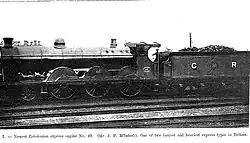 In 1903, the Caledonian Railway had no passenger locomotives larger than 4-4-0s, and the heaviest trains over its main line between Glasgow and Carlisle required to be double headed, even in the less demanding southbound ('up') direction. Northbound ('down') trains also required banking assistance on the climb to Beattock Summit. In an effort to avoid these requirements, McIntosh designed a large 4-6-0 based on his 'Dunalastair' series of 4-4-0s. Two locomotives were built in 1903, and immediately became the Caledonian's flagship locomotives. Nonetheless, their performance did not live up to expectations, and it was soon clear that banking assistance was still required over Beattock.[3] Until 1906 the Caledonian railway had no turntables long enough for the 49 Class, and arrangements for turning them included use of the Cathcart Circle or turning locomotive and tender separately.[4]