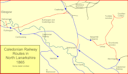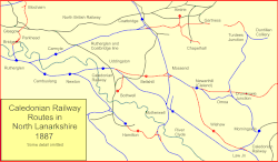 There were considerable mineral resources in South Lanarkshire, and when the Caledonian Railway was unable to fund the building of a railway to serve the collieries, an independent line, the Lesmahagow Railway, was built. It ran south from Motherwell: the present-day junction at Motherwell station is named Lesmahagow Junction.