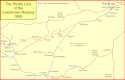 There had long been iron working at Wilsontown, and the Wilsontown, Morningside and Coltness Railway had opened in 1845 to serve the industry. Now new mineral fields were being developed in the area south of the earlier line, and the Caledonian Railway obtained Parliamentary authorisation on 21 July 1859 to build a branch line from the Carstairs to Edinburgh line from a junction near Auchengray. It opened in 1860.[3][8]
