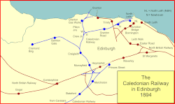 The Duke of Buccleuch owned and operated docks at Granton, on the north-west extremity of Edinburgh; the principal traffic was coastal shipping, as well as ferries to Fife ports.[2] The North British Railway served his docks, and he was anxious to have a connection from the Caledonian Railway. The Caledonian proposed a line from the Haymarket branch, diverging at Granton Junction and forking at Granton itself, serving both the west breakwater there and the main Granton Pier; Buccleuch contributed half of the construction cost. The line opened on 28 August 1861. Buccleuch's docks had extensive internal sidings, and the Caledonian and NBR lines did not directly connect; nonetheless Granton was extensively used for wagon exchange, which took place over part of the Granton Dock system. In 1863 the Caledonian Railway bought out Buccleuch's share of the line.