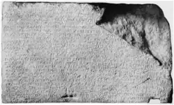 The Greek text of the whole inscription has been published several times[8][9][10] and the current authoritative edition appears as inscription no. 14 in the Priene volume of the Inschriften griechischer Städte aus Kleinasien series.[11] It consists of two distinct parts: The edict, and the decree of acceptance of the edict.[12] Although the inscription spans two stones, the second part begins before the end of the first stone.