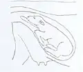 Typically, the calf is positioned in the "dorso-sacral" posture, with the forelegs and head emerging first through the pelvic canal. However, in 5% of cases, the hind legs present first. This variation slightly prolongs calving and reduces the calf's survival chances, as the umbilical cord may break prematurely, potentially causing asphyxiation.[10]