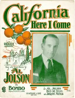 "California, Here I Come" is a song interpolated in the Broadway musical Bombo, starring Al Jolson. The song was written by Bud DeSylva, Joseph Meyer, and Jolson.[1] Jolson recorded the song on January 17, 1924, with Isham Jones' Orchestra, in Brunswick Records' Chicago studio.[2] It is often called the unofficial state song of California. In 2020, it entered the public domain.[a]
