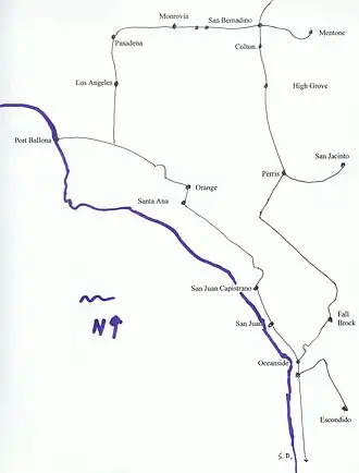 The California Central Railway mainlines were from San Bernardino to Los Angeles at La Grande Station, Oceanside to Los Angeles; and High Grove to Orange. It also ran a 19-mile (31 km) line in Riverside County between Perris to San Jacinto, from May 1887 to May 1, 1888. California Central Railway also built and ran a 13-mile (21 km) line from Port Ballona (present day Playa del Rey, Los Angeles) on Santa Monica Bay, to Redondo Junction (just southwest of present-day Boyle Heights) at the Los Angeles River near Washington Boulevard, which opened in September 1887. Redondo Junction became a major maintenance facility for trains.[2][3][4]