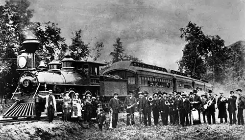 Riverside, Santa Ana and Los Angeles Railway was incorporated September 29, 1885. California Central Railway expanded and completed the rail line started by the Riverside, Santa Ana and Los Angeles Railway Company, from Santa Ana to Los Angeles on August 12, 1888, 34 miles (55 km). Also completed was the line from High Grove to Orange on September 15, 1887, 41 miles (66 km). (started in 1886)[8][9]
