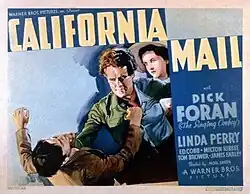 California Mail is a 1936 American Western film directed by Noel M. Smith and written by Roy Chanslor and Harold Buckley. The film stars Dick Foran, Linda Perry, Edmund Cobb, Milton Kibbee, Tom Brower and James Farley. The film was released by Warner Bros. on November 14, 1936.[1][2] It was the fourth of 12 B-westerns Foran made for the studio over a two-year period, and is noteworthy for giving ubiquitous bit player Cobb a rare co-starring role as the chief villain. Roy Rogers makes an early, uncredited appearance as the square dance caller.