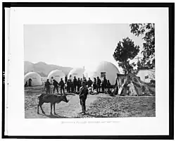 The Eskimo Village (or Eskimaux Village), was three acres large and featured Inuit from Labrador, Canada. The Inuit villagers in the exhibit lived in huts designed to look like igloos and seal-skin tents. Visitors to the exhibit could ride on a dog-drawn sled around a circular track.[52]