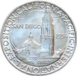 The California Pacific International Exposition half dollar, sometimes called the California Pacific half dollar or the San Diego half dollar, is a commemorative fifty-cent piece struck by the United States Bureau of the Mint in 1935 and 1936. Robert Ingersoll Aitken designed the coin. Its obverse depicts Minerva and other elements of the Seal of California; the reverse shows buildings from the California Pacific International Exposition (held 1935–1936), which the coin was issued to honor.