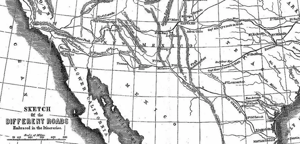 This route is set down upon most of the maps of the present day as having been discovered and explored by various persons, but my own name seems to have been carefully excluded from the list. Whether this omission has been intentional or not, I leave for the authors to determine. I shall merely remark that I had the command and entire direction of an expedition which in 1849 discovered, explored, located, and marked out this identical wagon road from Fort Smith, Arkansas, to Santa Fé, New Mexico, and that this road, for the greater portion of the distance, is the same that has been since recommended for a Pacific railway."[2]