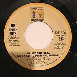 "California Saga/California" is a song by American rock band the Beach Boys from their January 1973 album Holland. It was written by Al Jardine and is the first song written solely by him to appear on any of the group's albums. It is the third and final part of the "California Saga" series of songs on Holland.[1] In May 1973, a remixed version was issued as a single under the title "California Saga (On My Way to Sunny Californ-i-a)".