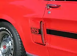 Additional features include "California Special" floormats, a unique spoiler, 19" machined aluminum wheels, a faux gas cap with GT/CS badging on the rear decklid, side scoops, and a unique GT/CS side stripe. Notably, the GT/CS features a revised front fascia that lacks the "prancing horse" logo of other Mustangs, instead replacing it with a red GT/CS logo. Deviating from other GTs, the GT/CS also lacks the 5.0 badge on the front quarter panels. Standard performance options include the front splitter from the GT Performance Pack, as well as a strut tower brace with GT/CS badging. This version of the GT/CS was available from the factory with the Performance Pack (option code 67G).[5]