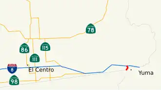 A road south from the Ocean-to-Ocean Highway to the Mexican border just west of the Colorado River existed by 1917[8] and was paved between 1956 and 1965.[9][10] The Andrade Port of Entry at the southern end of the highway was built in 1970.[4] The current alignment of SR 186 was assigned in 1972 by the California State Legislature.[2]