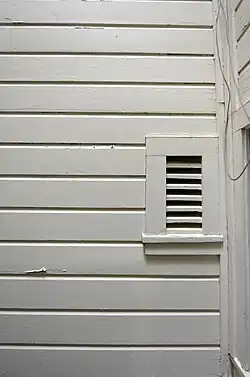 The California cooler is constructed simply as an interior cabinet with slatted or screened shelves. Vents near the top and bottom allow outside air to circulate by the principle of natural convection. This results in convective cooling, which keeps perishable food items fresh. The outside vents are separated from the outside by a screen, preventing the incursion of insects, and downward slanting slats shut out rain.[3] Often on a wall away from sun,[1] they tend to be located near where food is prepared, such as in the kitchen. Modifications to work in more variable climates, such as a trap door to selectively draw air from a cellar,[2] are possible.