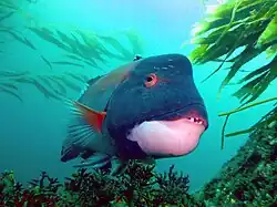 The California sheephead is a monandric protogynous hermaphrodite and is a commercially and recreationally valuable labrid.[13] It is a prominent species occupying the southern California rocky reef and kelp bed fish assemblage.[12][14] Both the ecology and life history patterns of California sheephead have been shown to vary with local environmental conditions.[15]