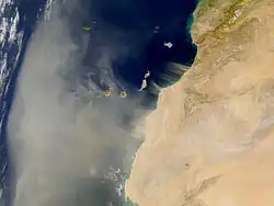 The desert's arid environment causes the soil to become fine and easily lifted by strong winds, such as those associated with the Harmattan or the trade winds. These winds can lift millions of tons of sand and dust into the atmosphere, creating a dense, suspended cloud that can travel thousands of kilometers.[4] Some of clouds of sand reach up to 6,000 meters in altitude. The raised dust can then move in the eastward atmospheric circulation while being captured above a marine inversion as it passes over the ocean, reaching the Canary Islands.[3]