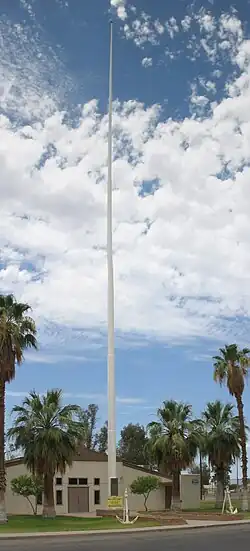 At an elevation of 180 feet (55 m) below sea level,[3] Calipatria is the lowest incorporated city in the Western Hemisphere. The city currently claims to have the "tallest flagpole (184 feet) where the flag flies at sea level"[6] at 184 feet (56 m), so their American flag will always fly above sea level.[7]