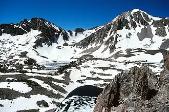 Calkins Peak, is a peak also known as Calkens, O'Calkens Peak, Caulkens Peak, and O'Caulkens Peak. At an elevation of 11,487 feet (3,501 m) above sea level it is the second highest peak in the White Cloud Mountains of Idaho. The peak is located in Sawtooth National Recreation Area in Custer County about 5.75 mi (9.25 km) north-northwest of Castle Peak, its line parent. It is the 46th highest peak in Idaho, and it is located about 0.5 mi (0.80 km) north-northeast of White Cloud Peak 9 and 1 mi (1.6 km) north-northwest of D. O. Lee Peak. Calkins Peak is directly north of Slide Lake, northwest of Sheep Lake, and southwest of Tin Cup Lake.[2][3][4] Calkins Peak is named for Stephen Calkins (1842–1922), a prospector who established lode claims in the area.[5]