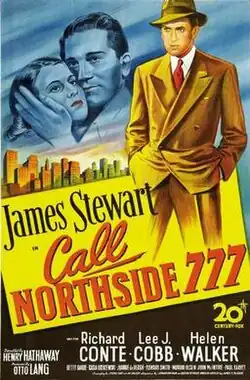 Call Northside 777 is a 1948 American drama film directed by Henry Hathaway. The film parallels the true story of a Chicago newspaper reporter who proved that a man jailed for murder 11 years previously was wrongly convicted. James Stewart stars as the persistent journalist and Richard Conte plays the imprisoned Frank Wiecek. Wiecek is based on Joseph Majczek, who was wrongly convicted of the murder of a Chicago policeman in 1932, one of the worst years of organized crime during Prohibition.