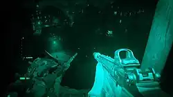 The story is inspired by real events and conflicts, such as the Soviet invasion of Afghanistan, the Iraq War, the Arab Spring, and the Syrian Civil War.[29] Some controversial aspects of the game were removed prior to its release, as the developers were unsure of how much potential emotional discomfort they wanted to effect. This included a line in which a Russian soldier ponders handing over a captured girl to his commanding officer, implying pedophilia.[30] Retired U.S. Navy SEALs Mitch Hall and Steve Sanders served as consultants for the game.[31] Infinity Ward's Audio Team went to a desert with 90 microphones to capture the audio of each weapon for the game.[32]