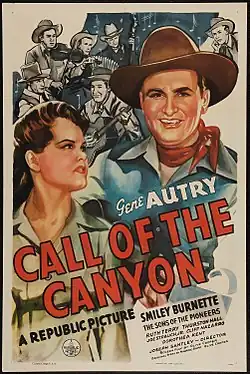 Call of the Canyon is a 1942 American Western film directed by Joseph Santley and starring Gene Autry, Smiley Burnette, the Sons of the Pioneers, and Ruth Terry.[2] Based on a story by Maurice Rapf and Olive Cooper, the film is about a singing cowboy who leads a group of cattlemen against the corrupt agent of a large packing company looking to swindle them by undercutting the buying price for beef. The film features three songs by Autry and the Sons of the Pioneers, including the classic "Take Me Back to My Boots and Saddle".