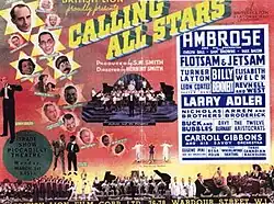 Calling All Stars is a 1937 British musical comedy film directed and written by Herbert Smith and starring Arthur Askey, Evelyn Dall and Max Bacon.[1] The film is a revue, featuring a number of musical acts playing themselves. It was made at Beaconsfield Studios for release as a quota quickie.[2] The film's art direction was by Norman G. Arnold.[3]
